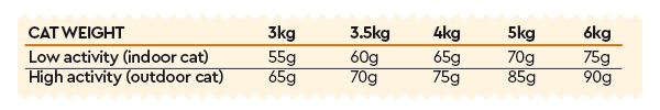 Για γάτες άνω των 6 κιλών ,προσθέστε 10-15γρ ξηρής τροφής για κάθε επιπλέον κιλό της γάτας