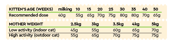 For more than 6kg ,add 10-15gr of dry food each additional 1kg